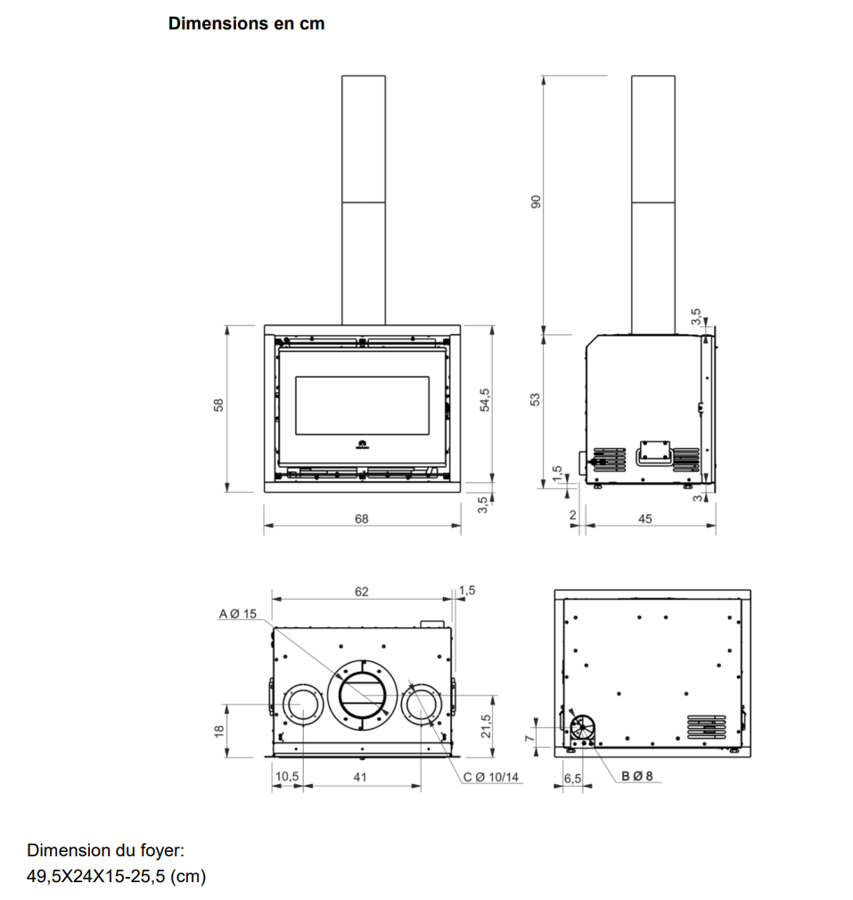 • foyer en Ecokeram blanc ou noir et surface de combustion en fonte • sortie des fumées Ø 15 vers le haut • air chaud canalisable vers 2 pièces adjacentes (kit optionnel) • système de nettoyage vitre • post-combustion • poignées pratiques pour le transport et l’installation • ouverture latérale (lors de l’assemblage, elle peut être installée avec l’ouverture de la porte à gauche ou à droite) • disponible en version: N (convection naturelle) ou V (ventilation forcée) avec ventilateur centrifuge intégré et panneau de commande à écran tactile.